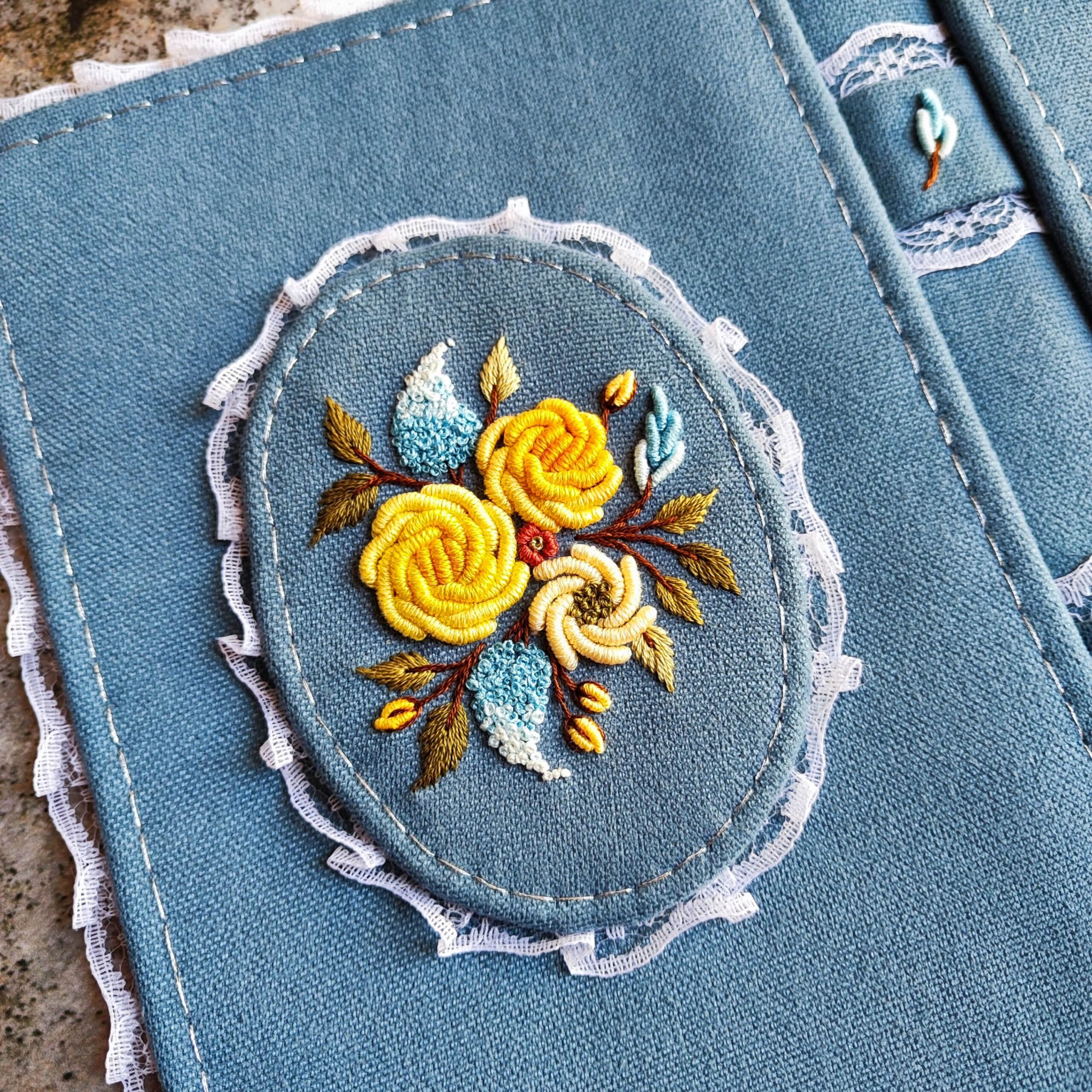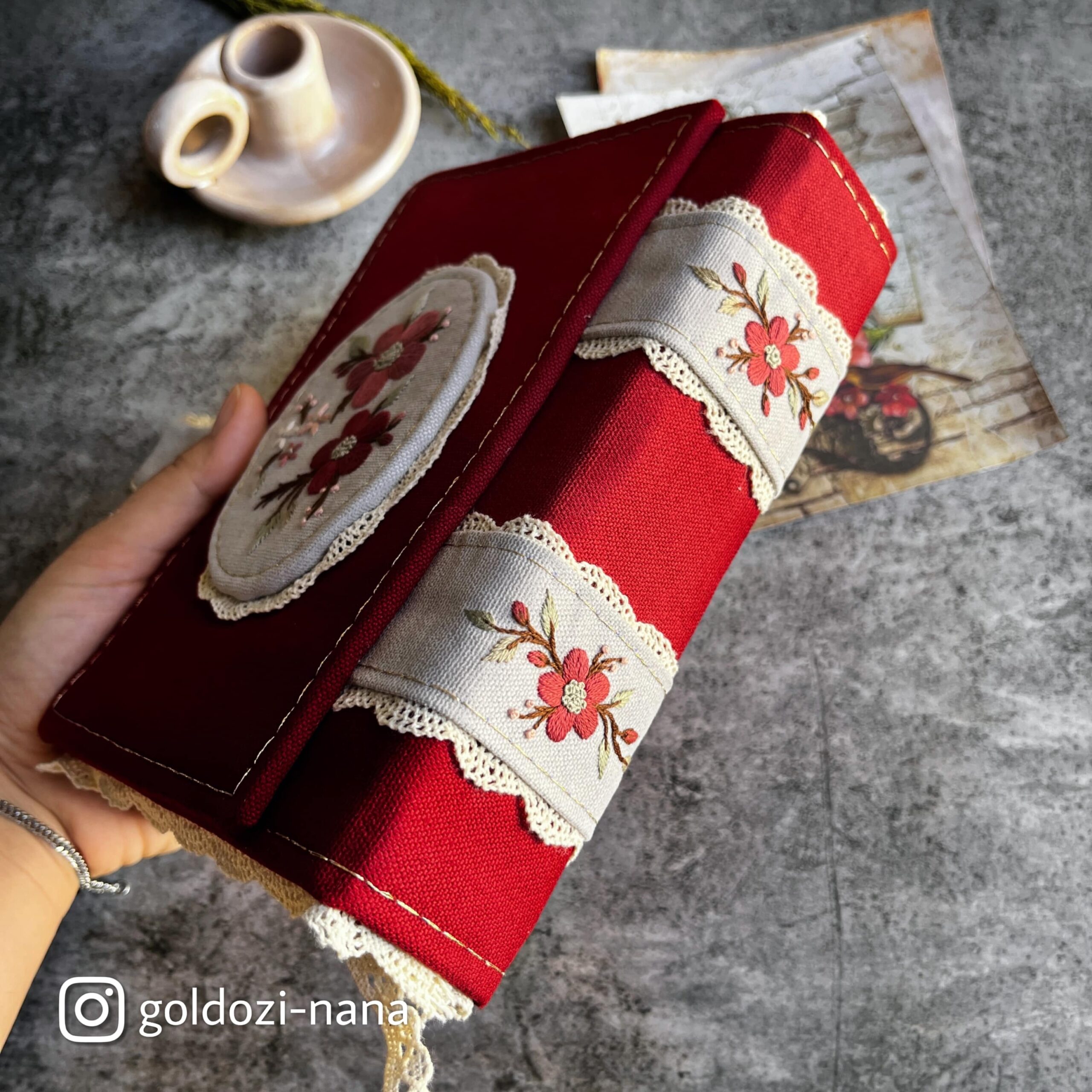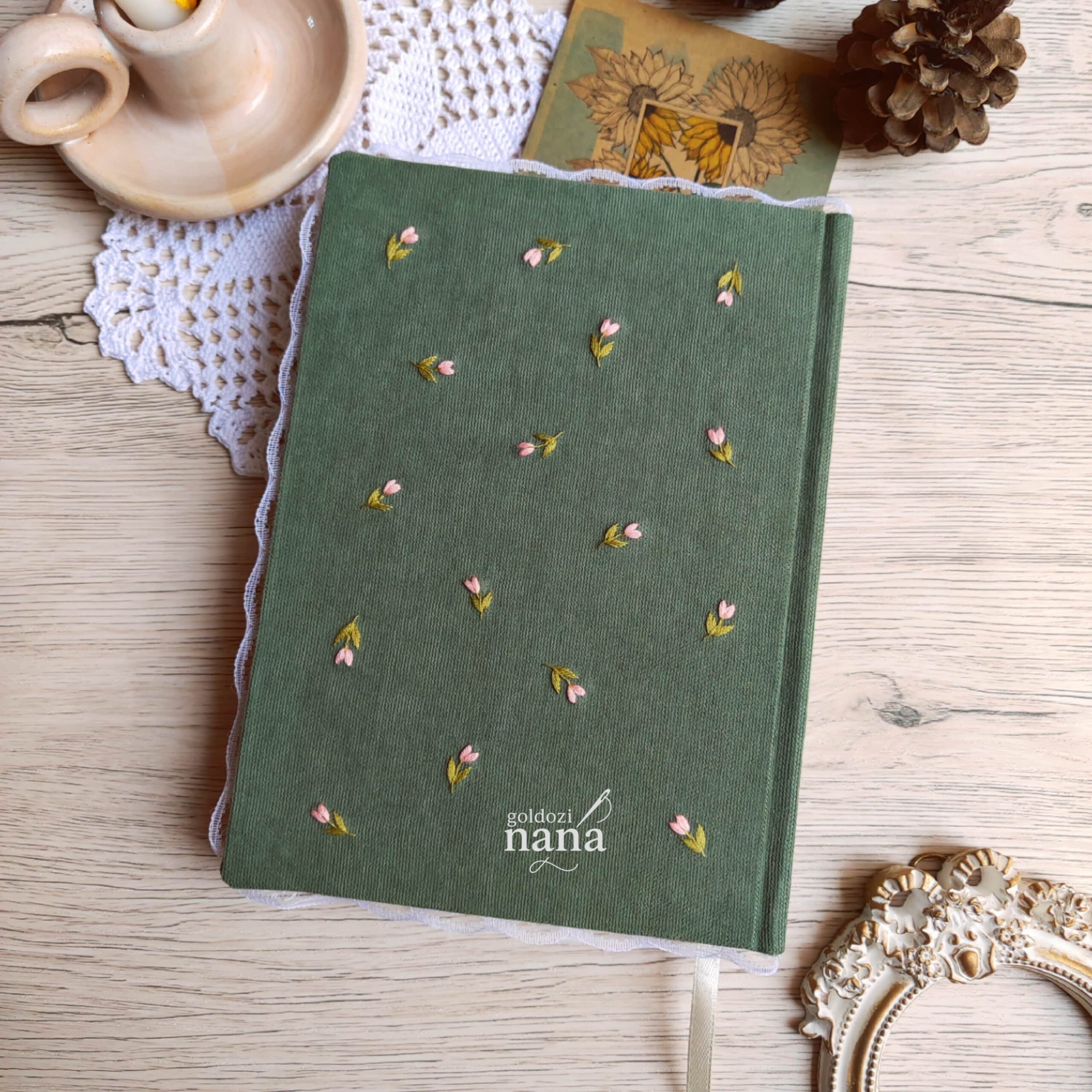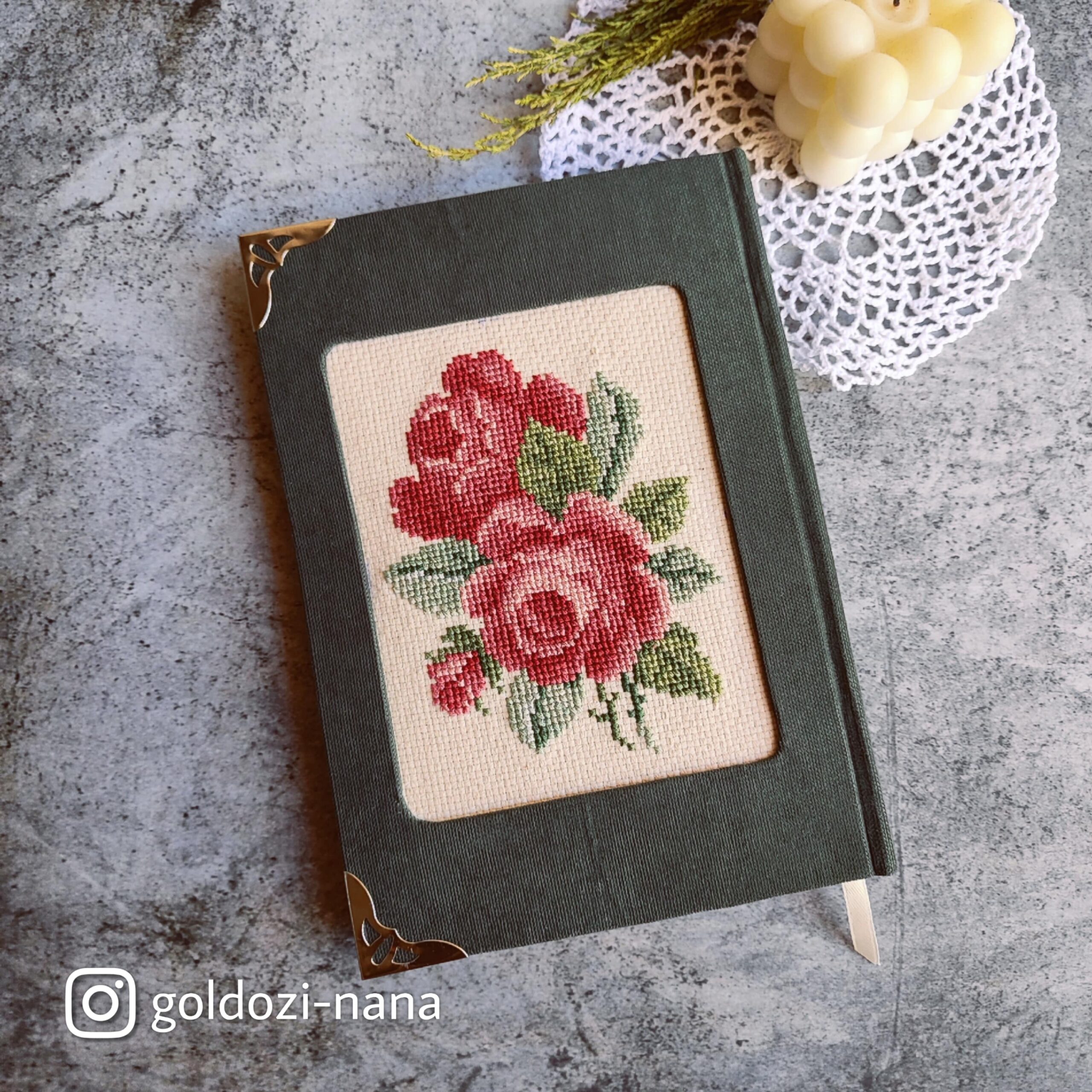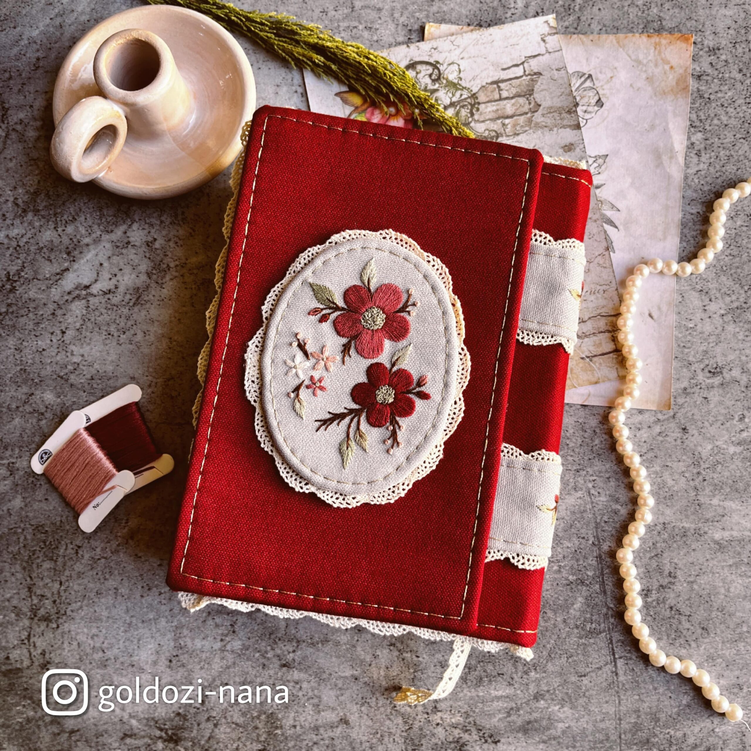 و از سال 401 بعد از کلی تمرین و آموزش، صحافی و جلد سازی رو یاد گرفتم و تبدیل شدم به تولید کننده دفتر با جلدهای گلدوزی.